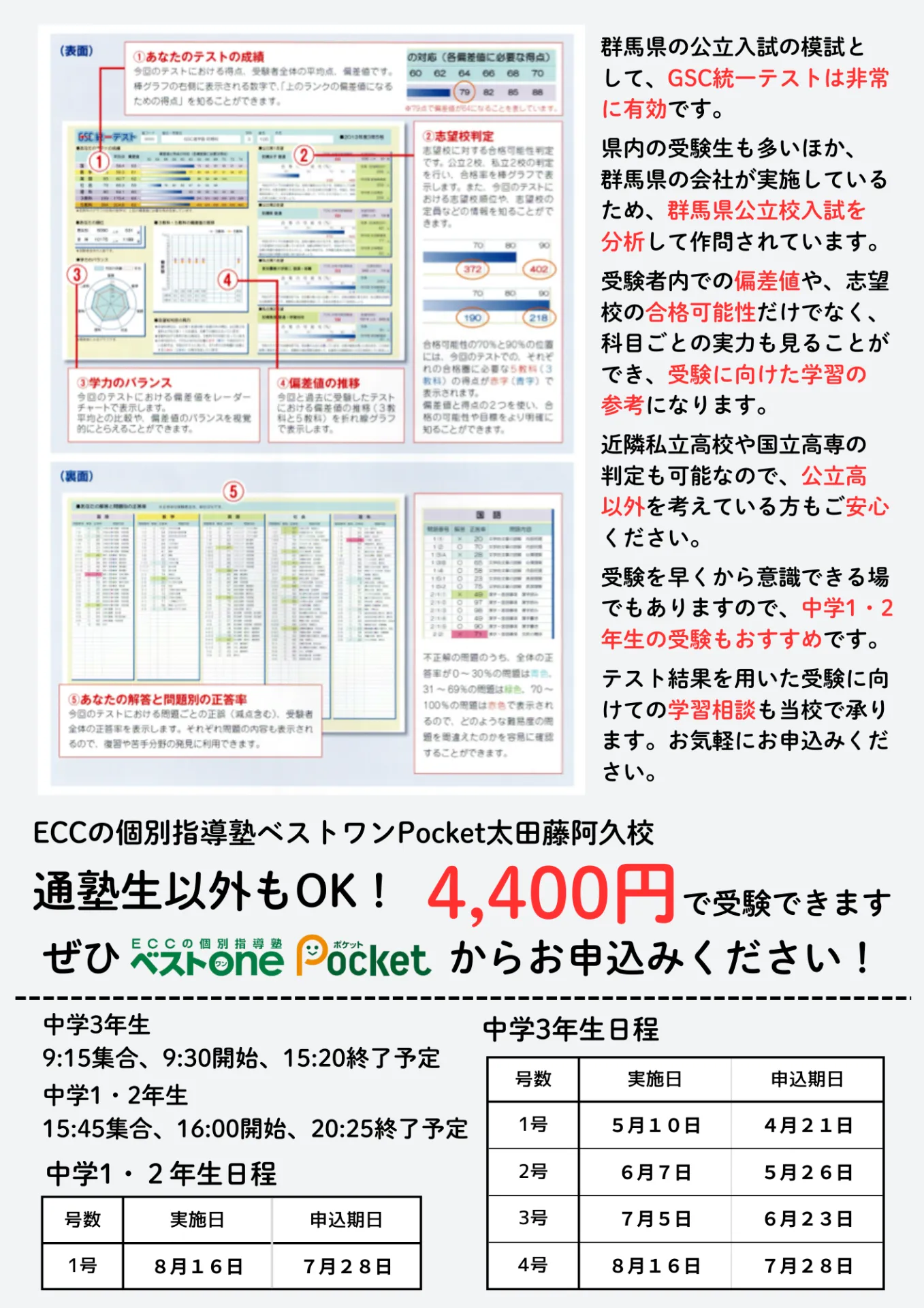GSC統一テストは(株)GSCが運営する群馬県公立高校入試向けの模試となっています。群馬県公立高校入試に対応する唯一のテストであり、過去の問題を分析して作成されているため、偏差値の算出や志望校判定の正確性も高いものとなっています。